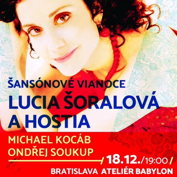Adventný čas im spríjemní šansónovými skladbami, ktoré tak milujú. Okrem vlastných piesní zaspieva aj skladby československých hudobných legiend! Šansoniérka, muzikálová herečka a v neposlednom rada skladateľka je už vo vynikajúcej forme. Participovala aj na najnovšom albume Richarda Müllera „55“, ktorý má obrovský úspech. Len pár týždňov po vydaní už získal platinovú platňu! Lucia na album naspievala vokály, čo mu jednoznačne dodalo jemný „šmrnc“! Nenechajte si ujsť večer plný nádherných melódií v podaní šansoniérky a jej hostí Michaela Kocába a Ondřeja Soukupa! Stretneme sa v Ateliéri Babylon v Bratislave 18. decembra!